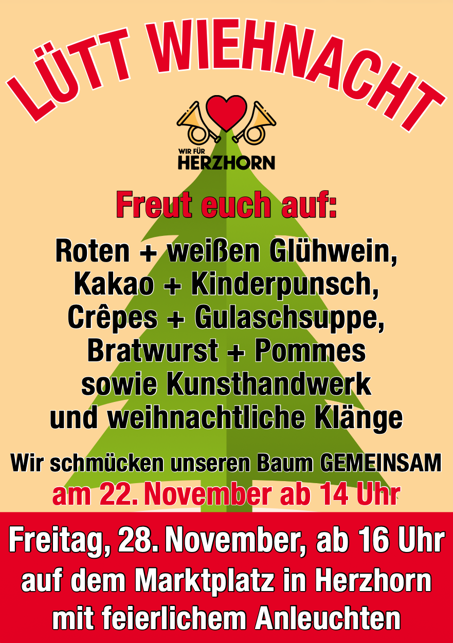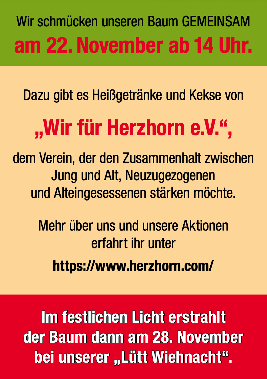 Wie bereits in den vergangenen zwei Jahren lädt der Verein „Wir für Herzhorn“ am Freitag, 28. November, ab 16 Uhr wieder zu einem Mini-Weihnachtsmarkt mit diversen Buden und lokalen Händlern vor der Linde ein, die selber mit diversen Angeboten lockt.